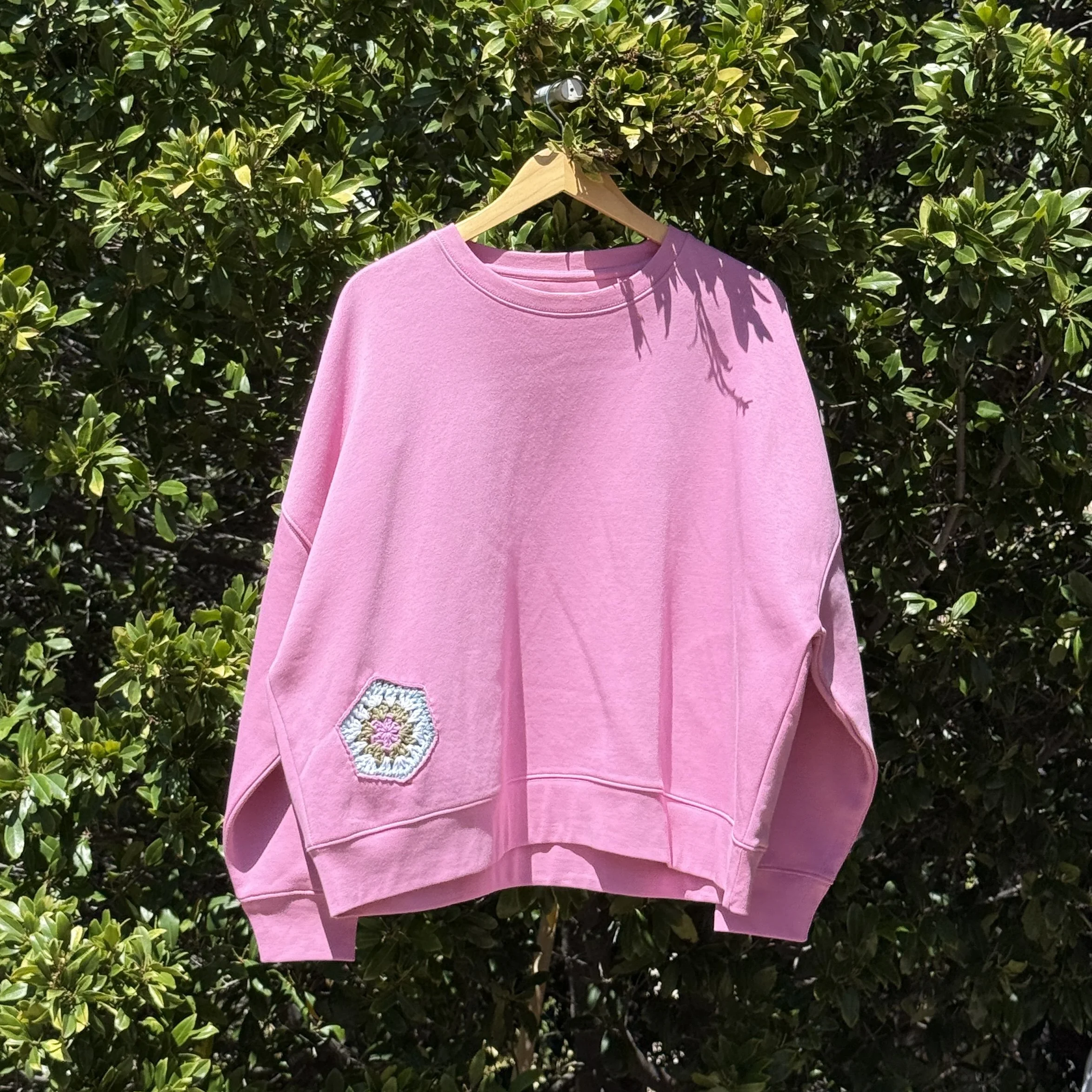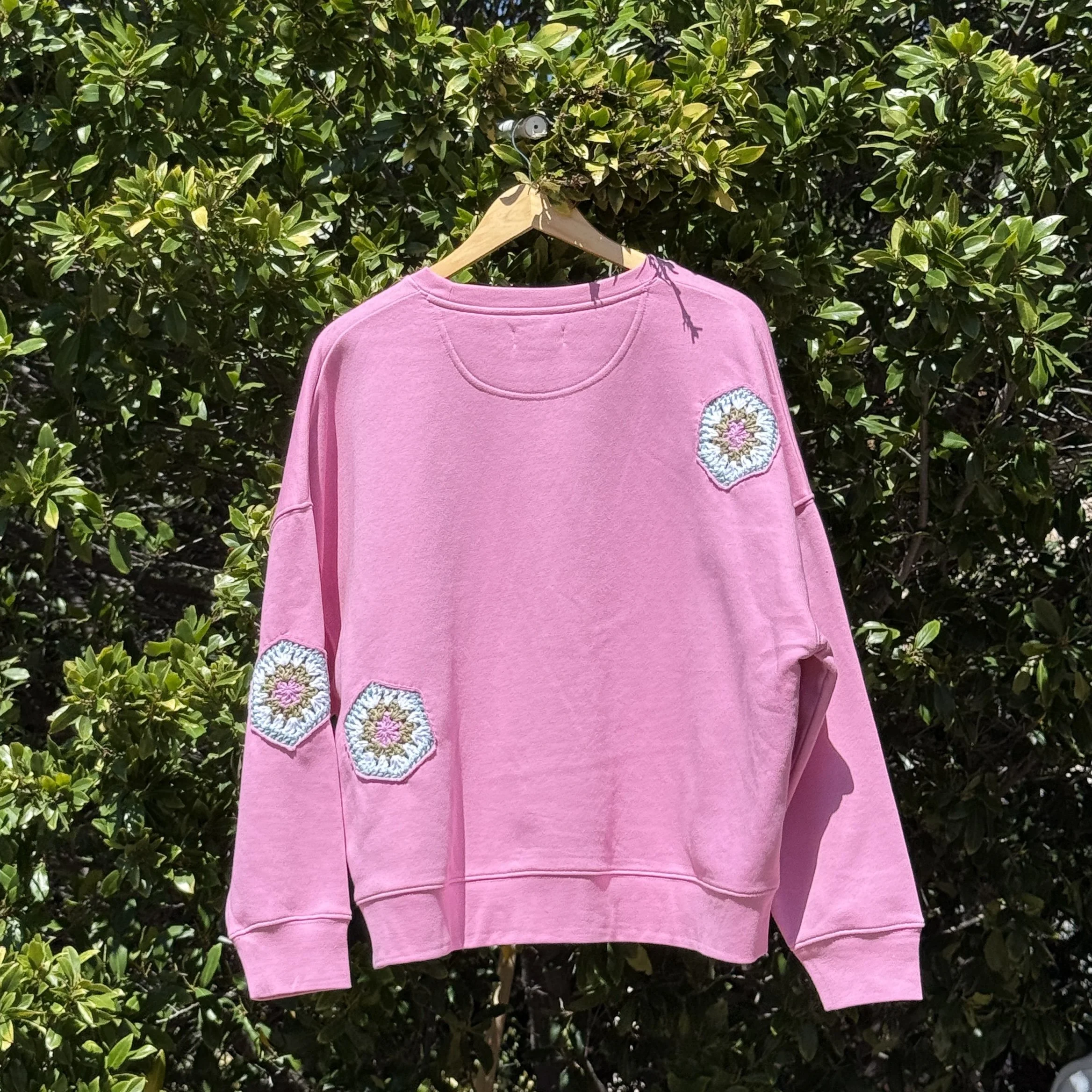 Medium weight crewneck sweatshirt decorated with crochet doodles.