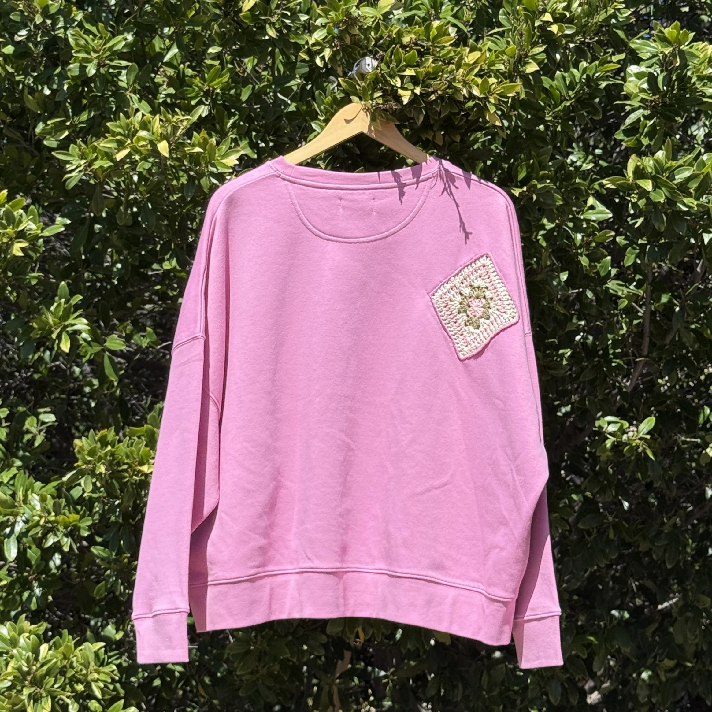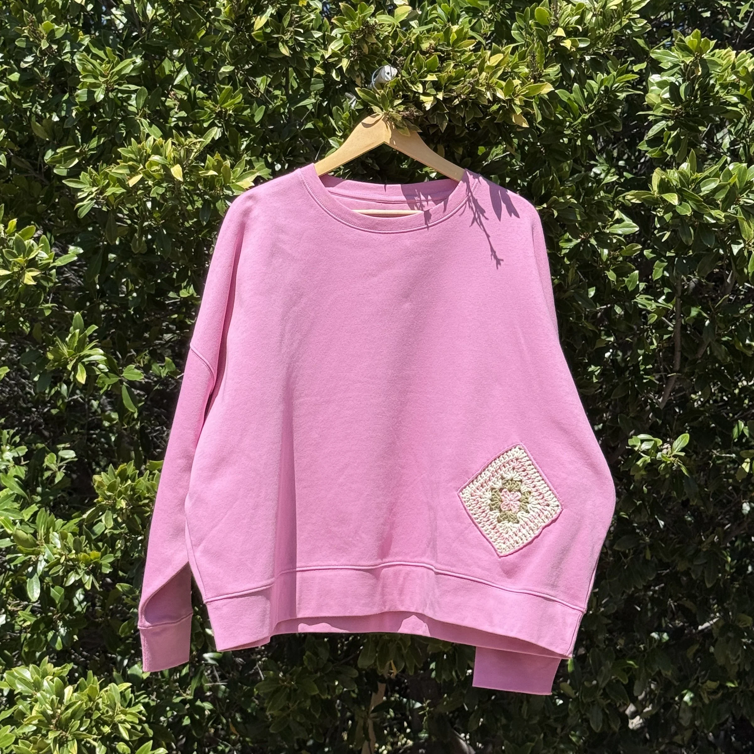 Medium weight crewneck sweatshirt decorated with crochet doodles.