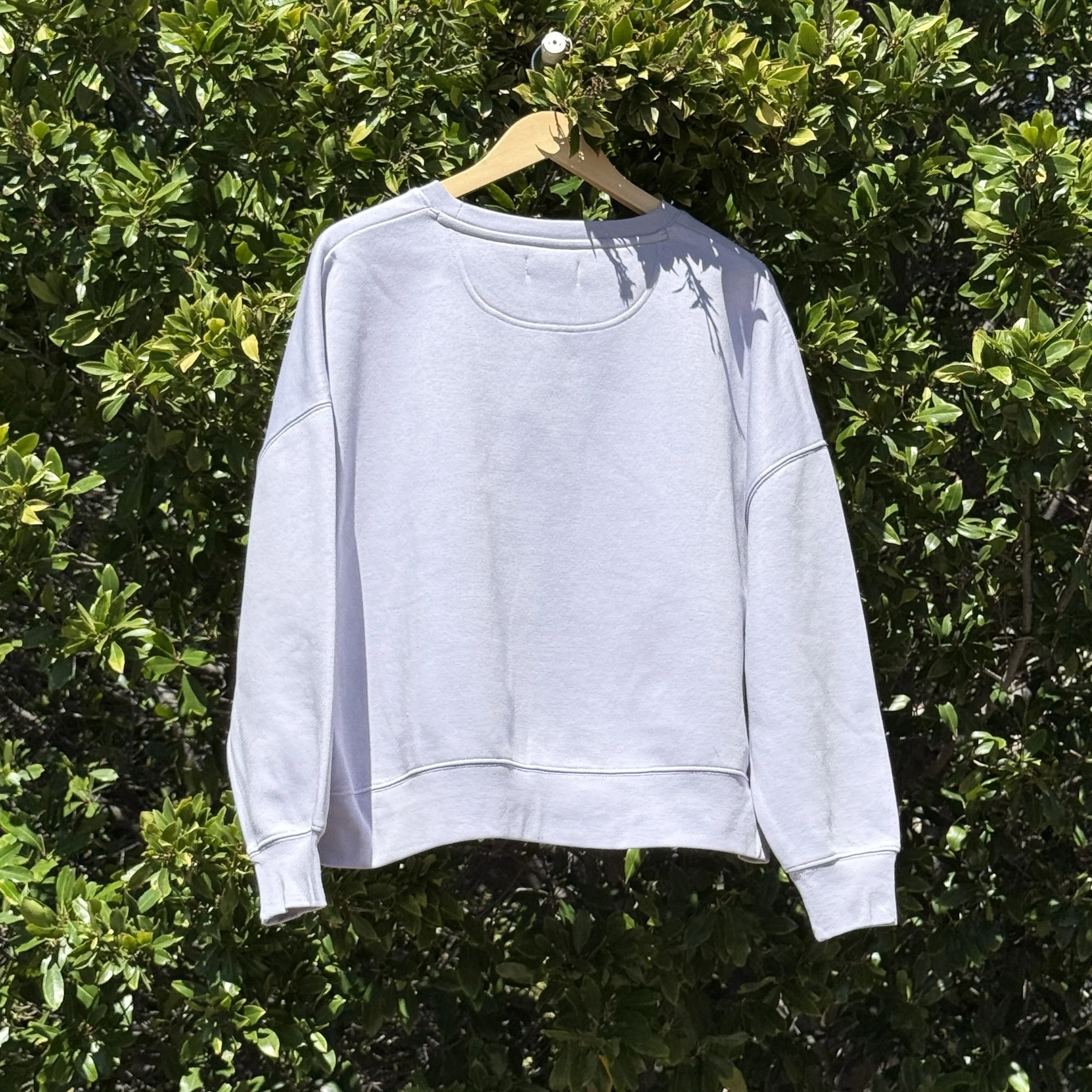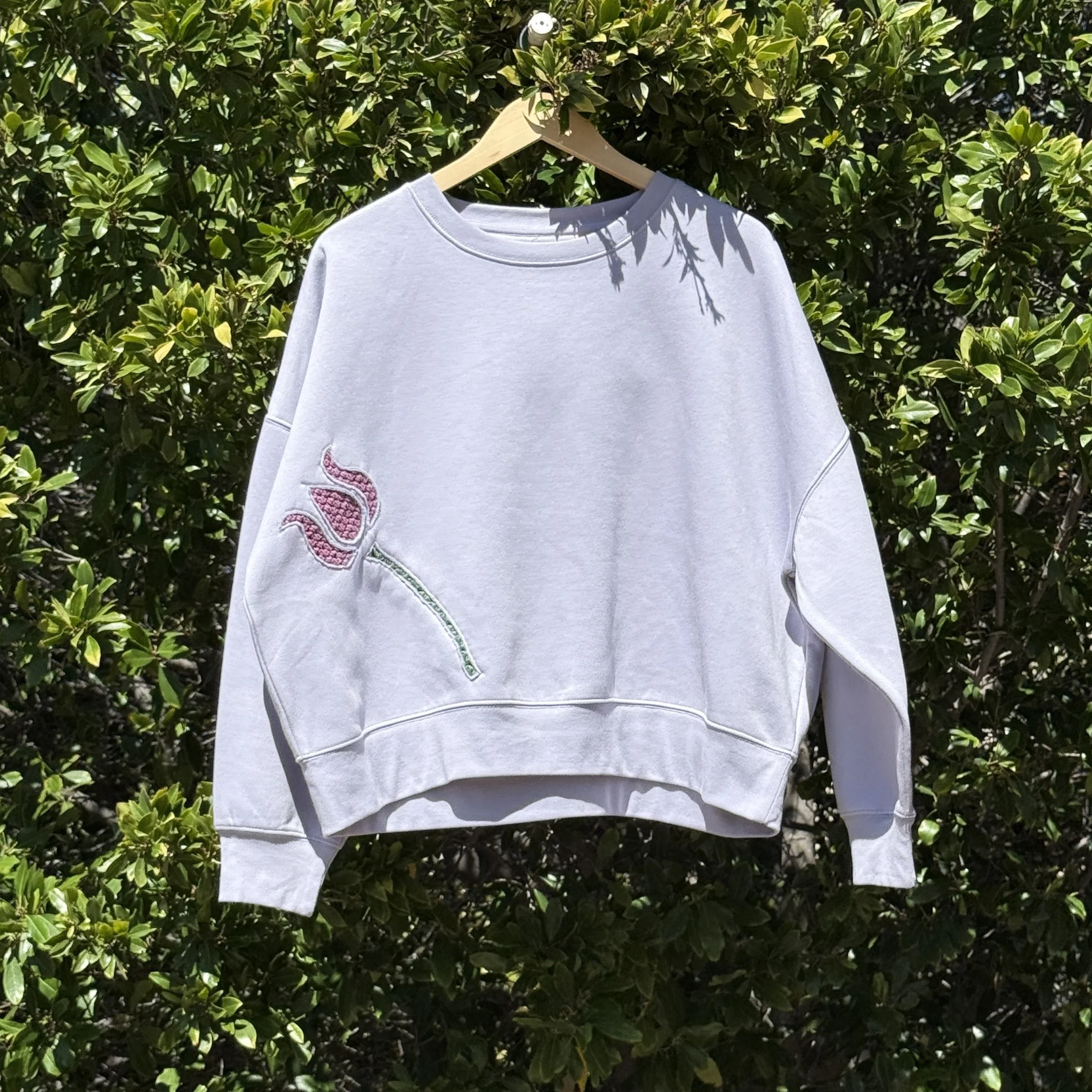 Medium weight crewneck sweatshirt decorated with crochet doodles.
