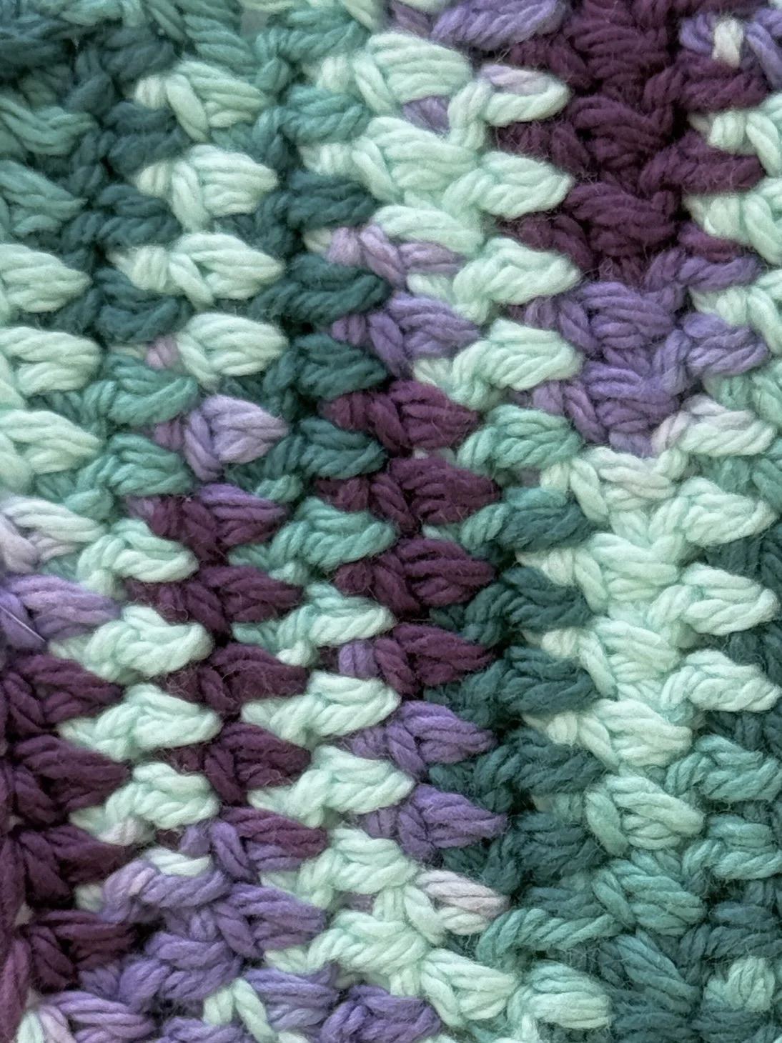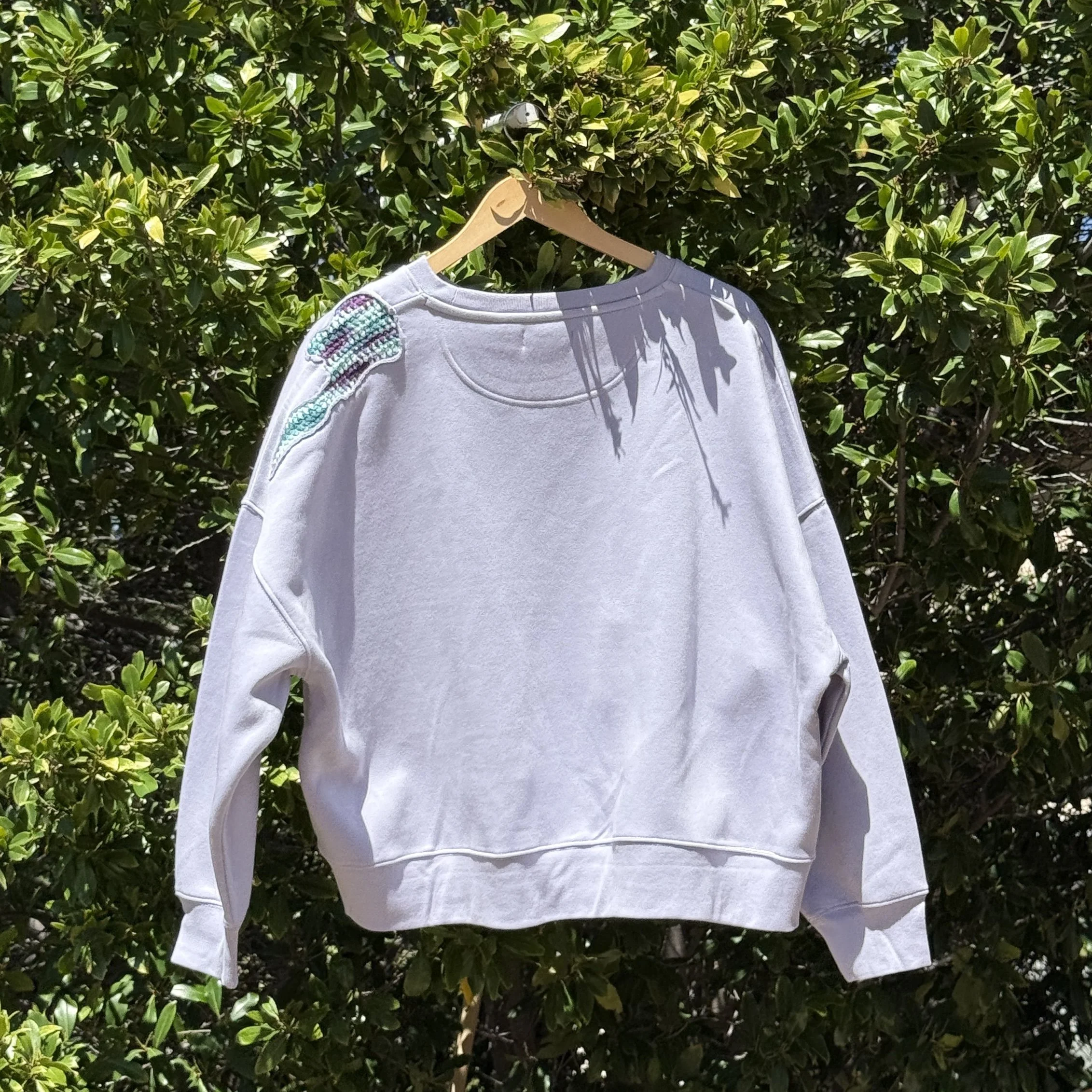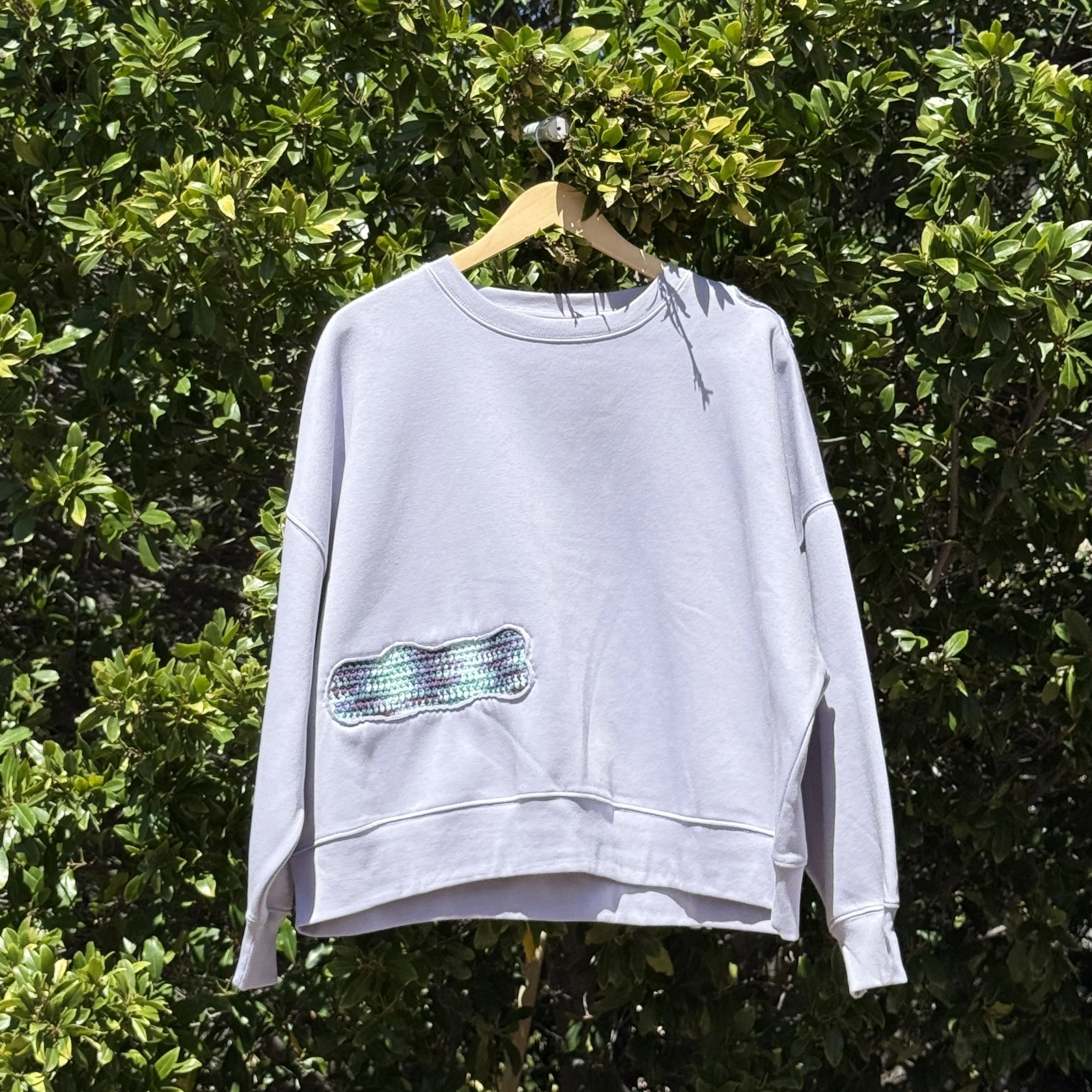 Medium weight crewneck sweatshirt decorated with crochet doodles.
