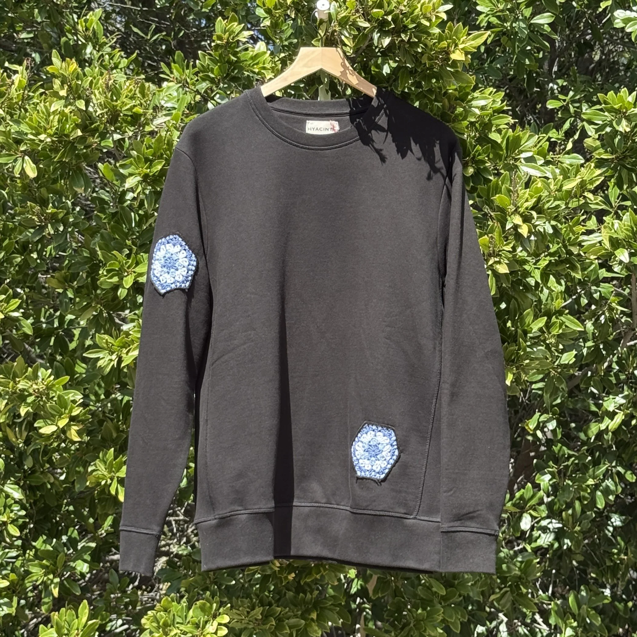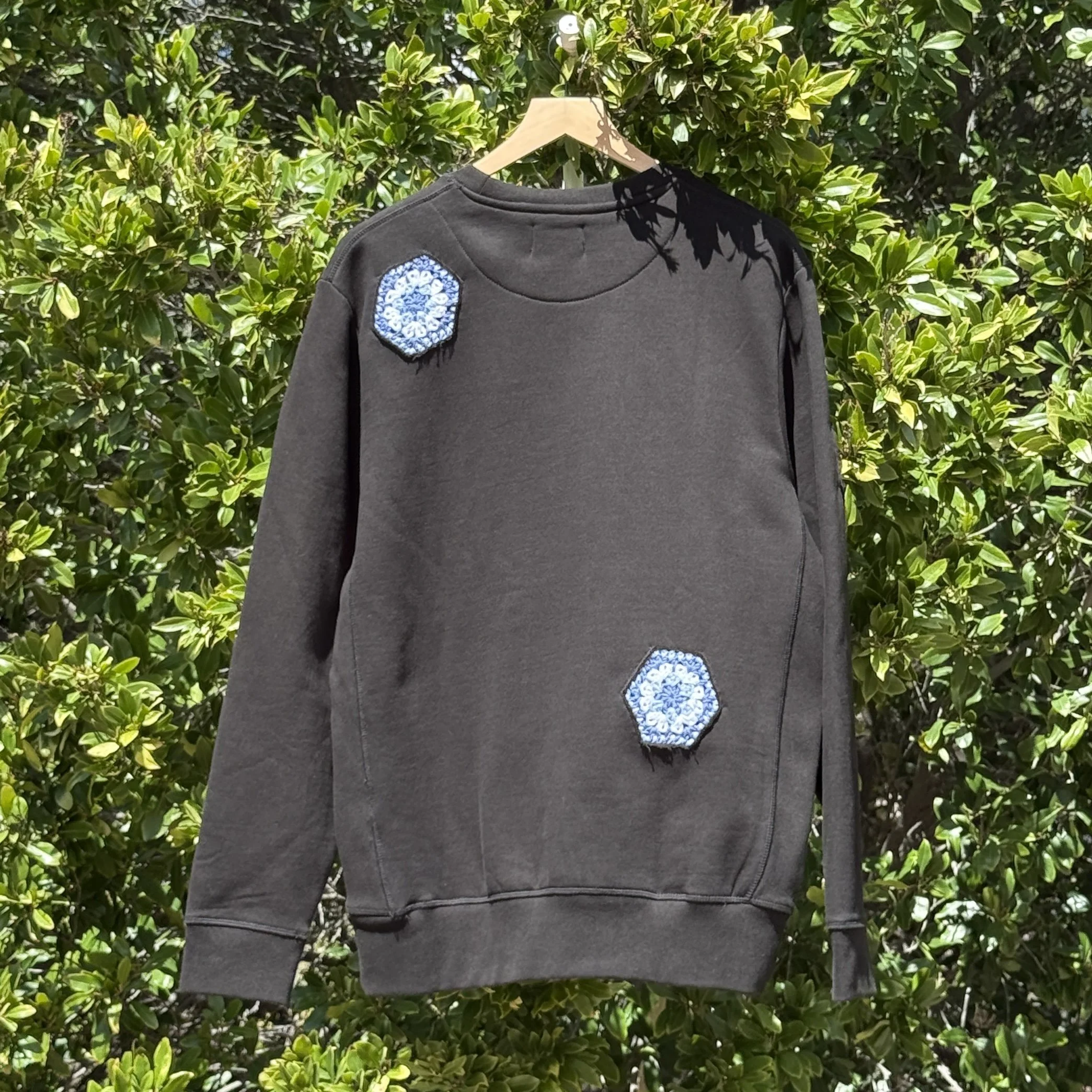 Heavy weight crewneck sweatshirt decorated with crochet doodles.