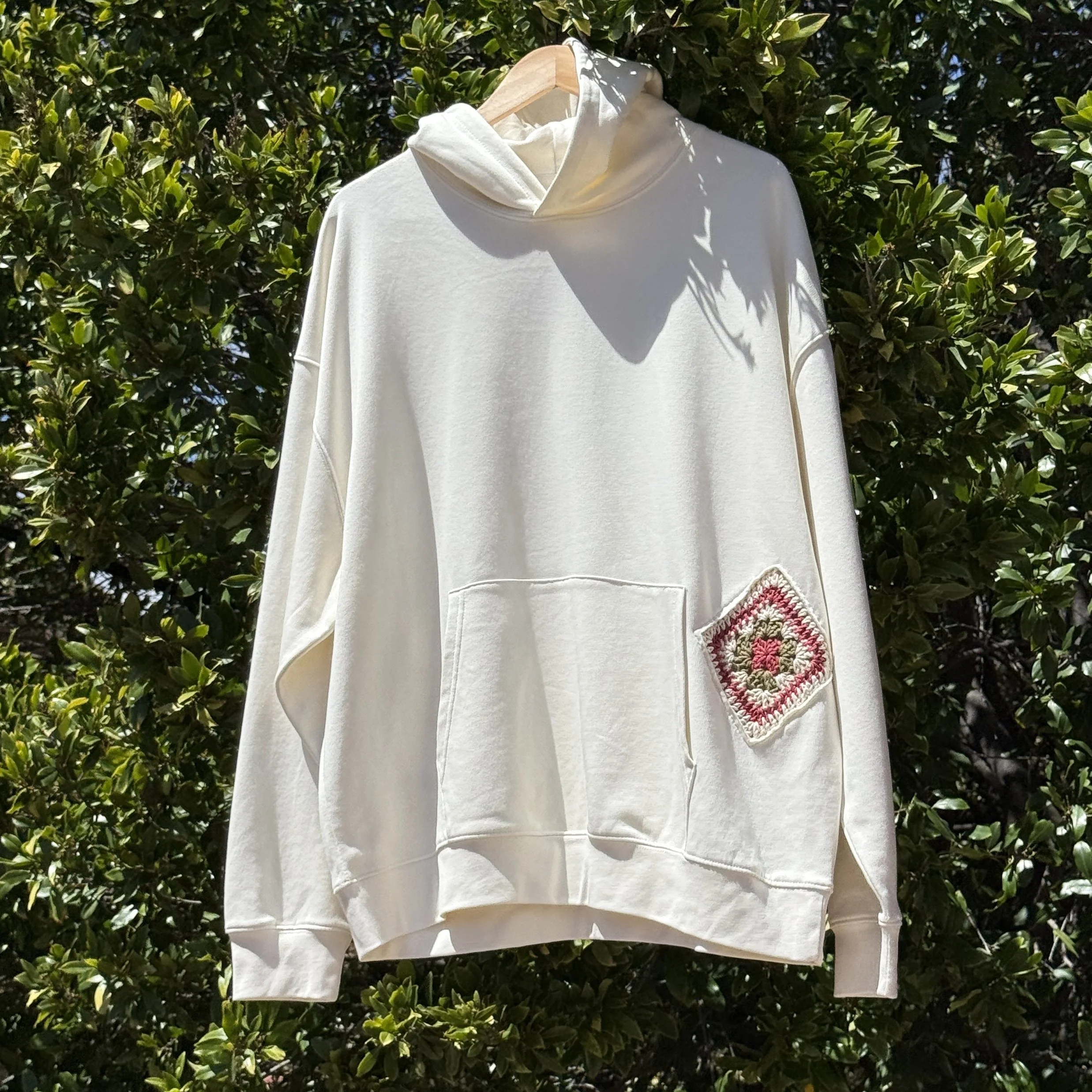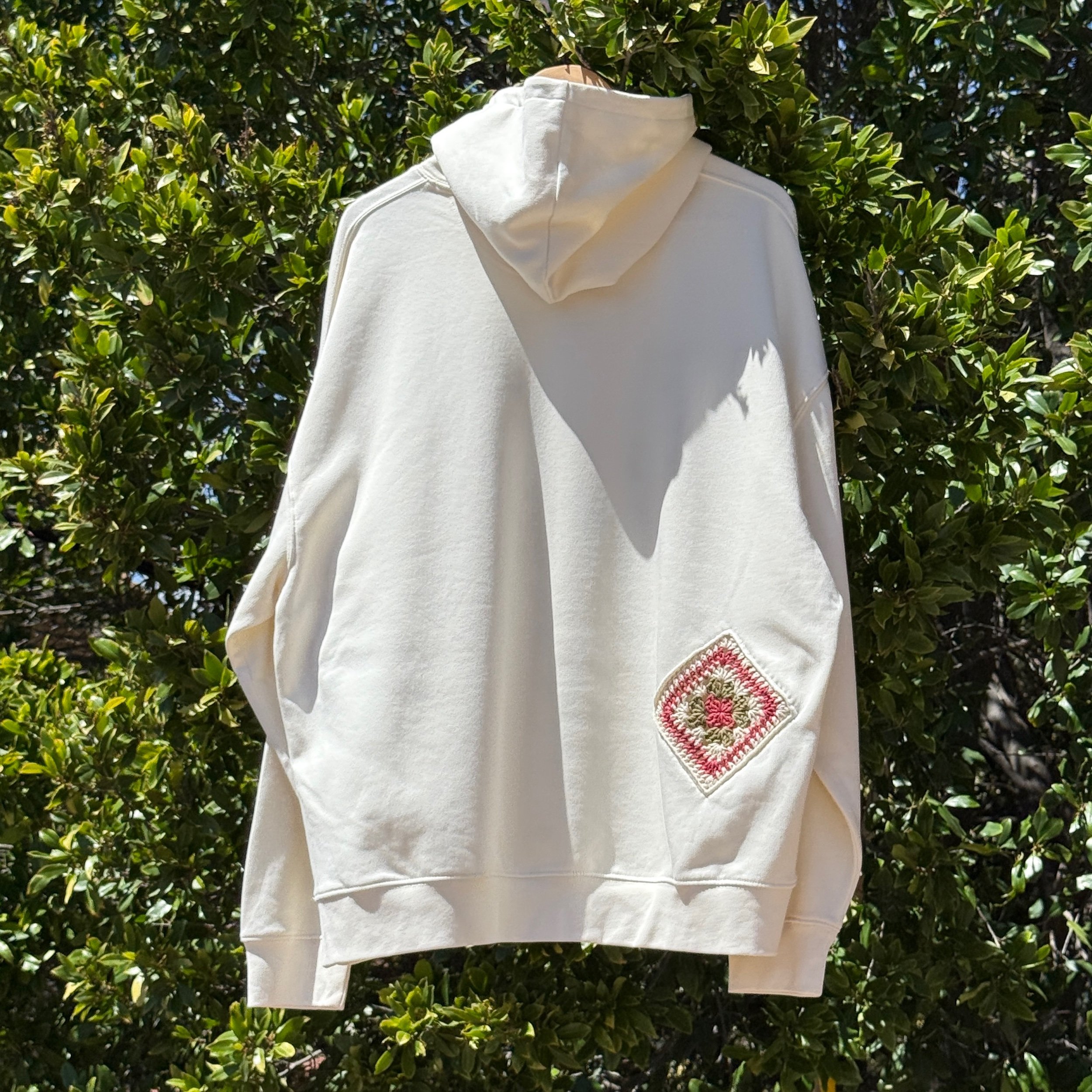 Medium weight hoodie sweatshirt decorated with crochet doodles.