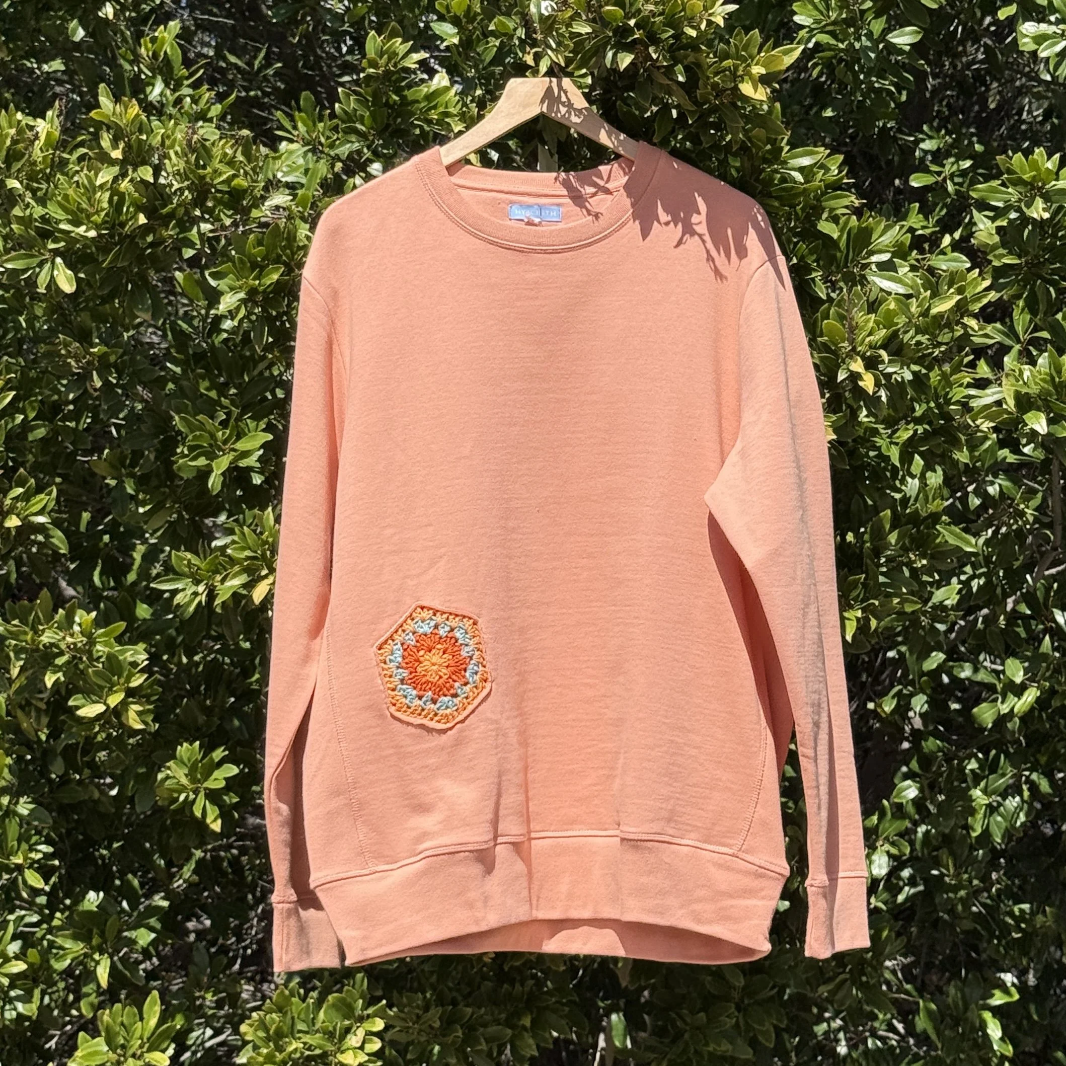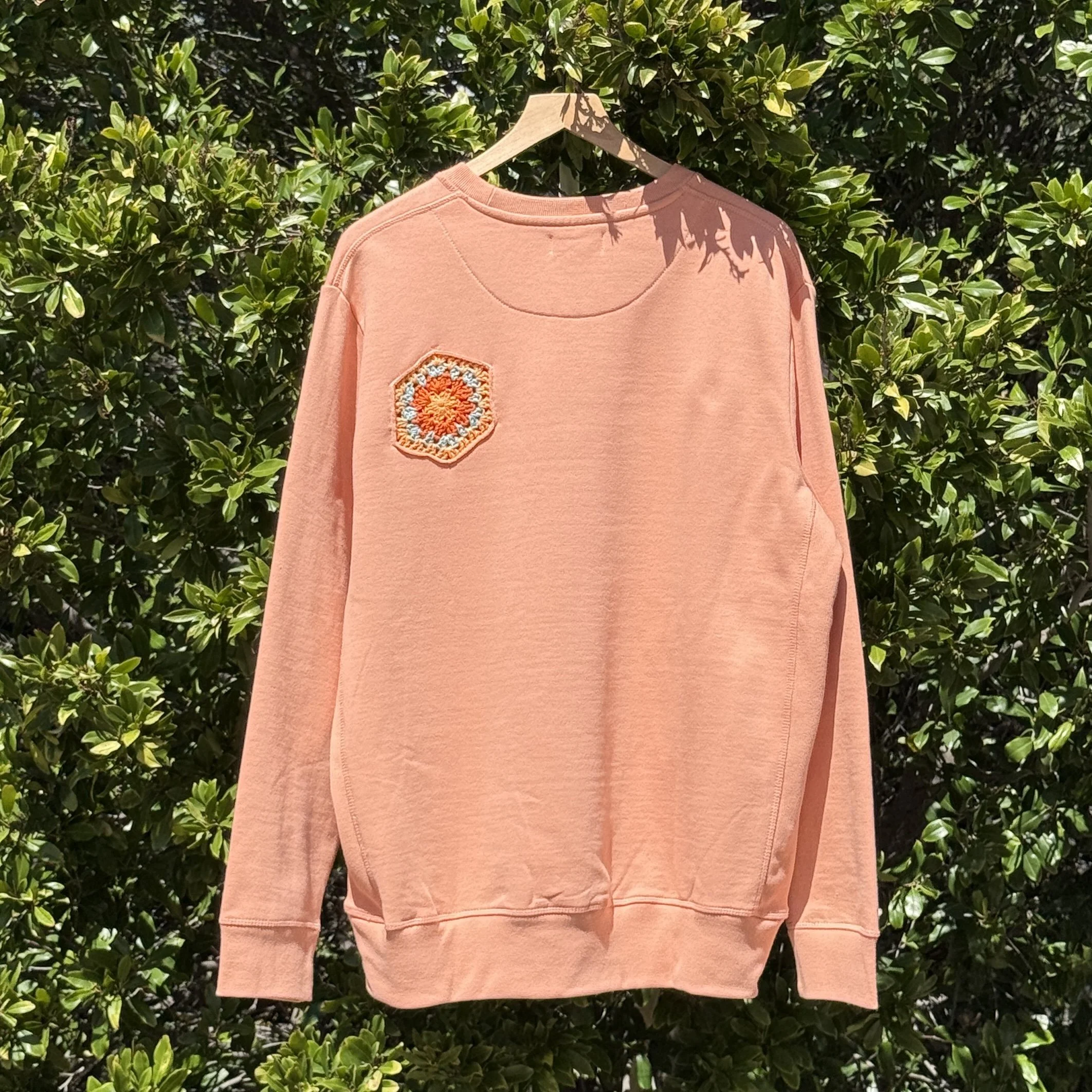 Heavy weight crewneck sweatshirt decorated with crochet doodles.