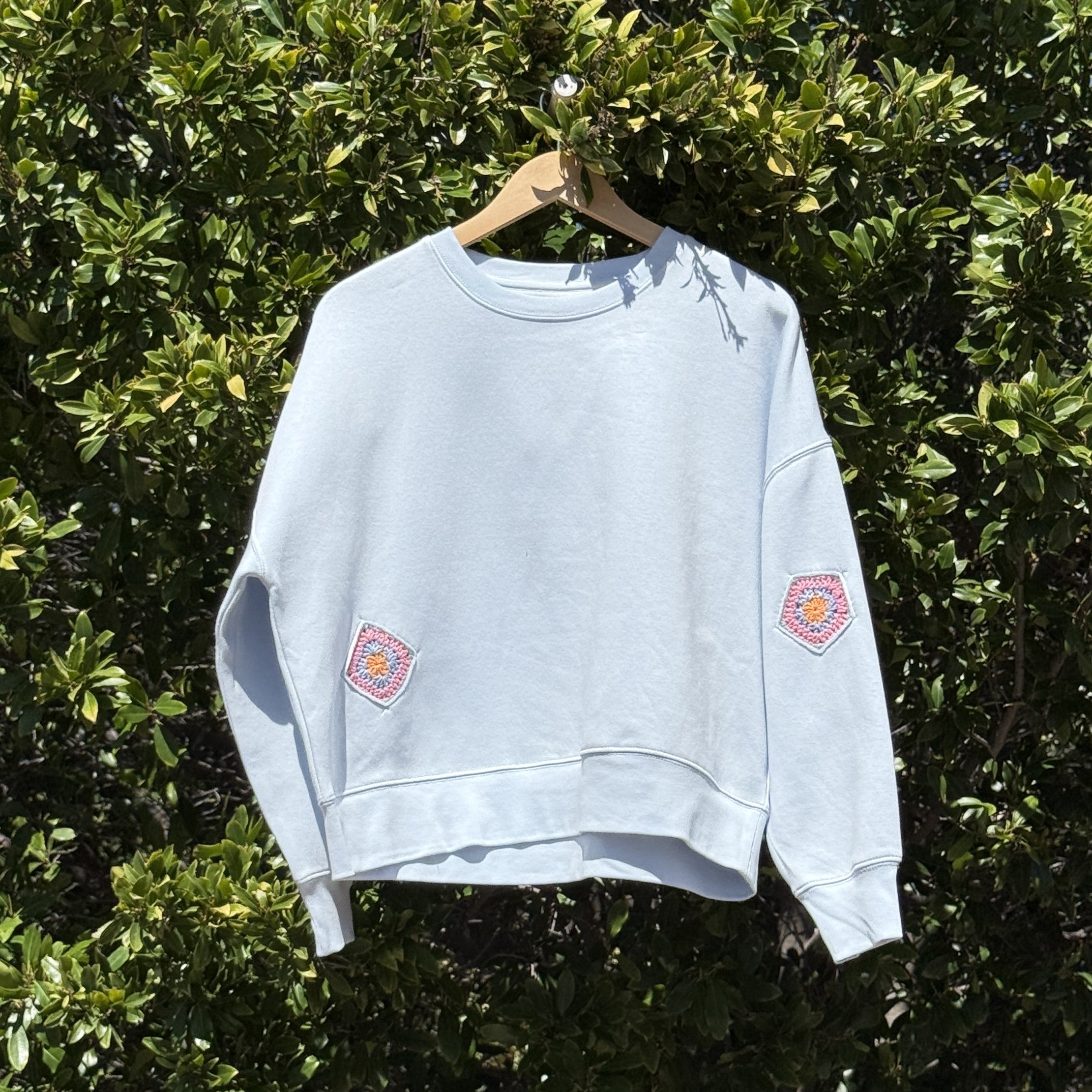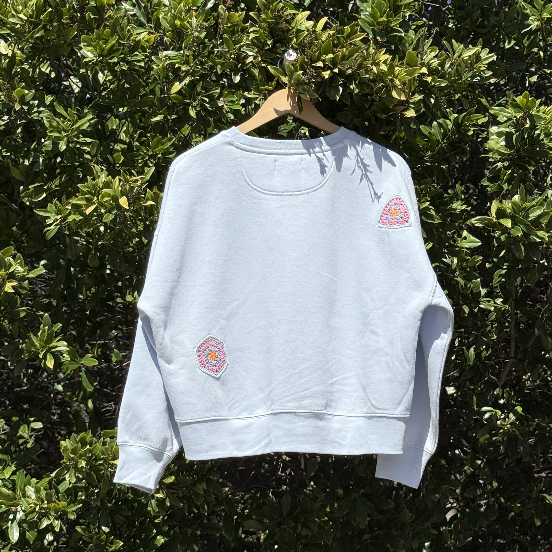 Medium weight crewneck sweatshirt decorated with crochet doodles.