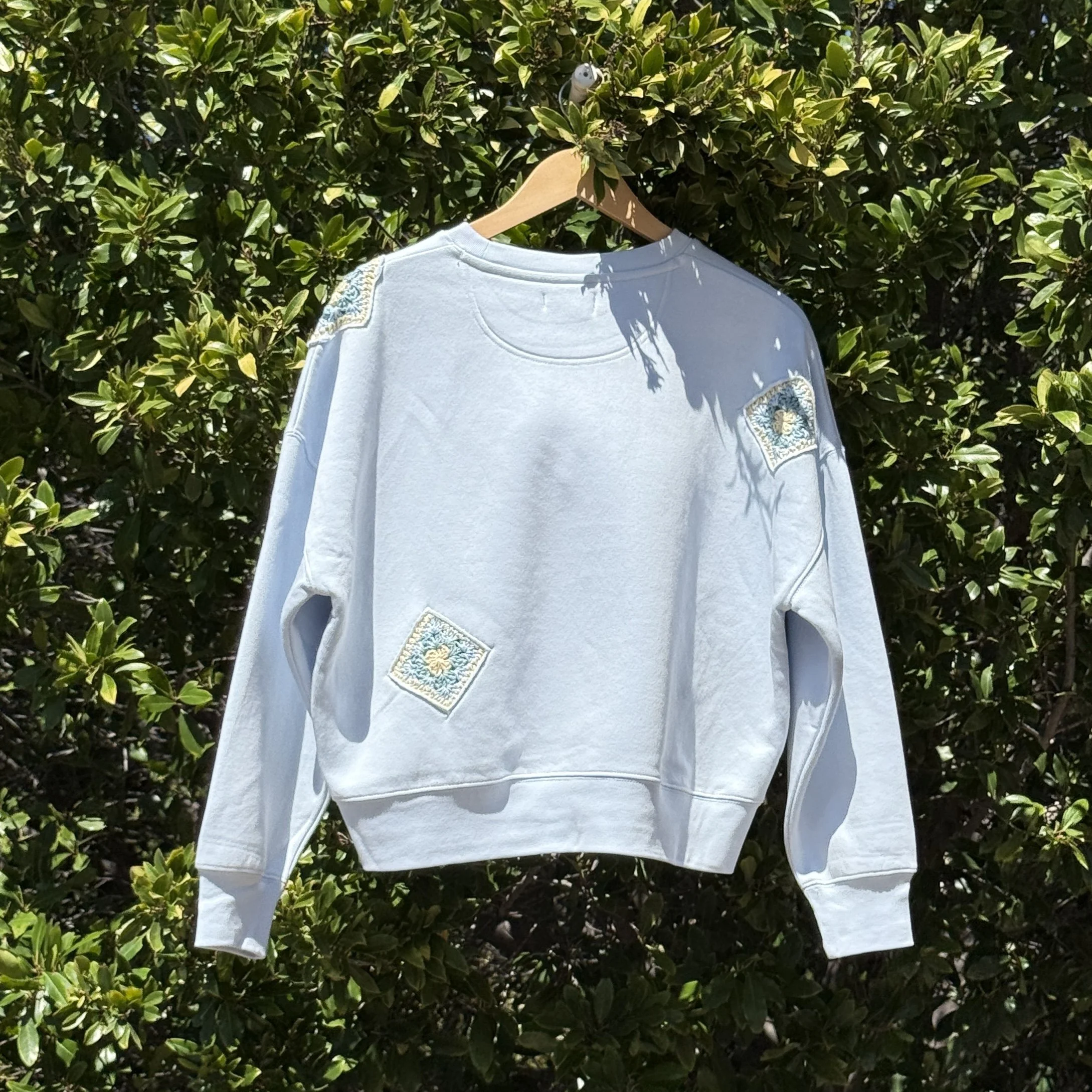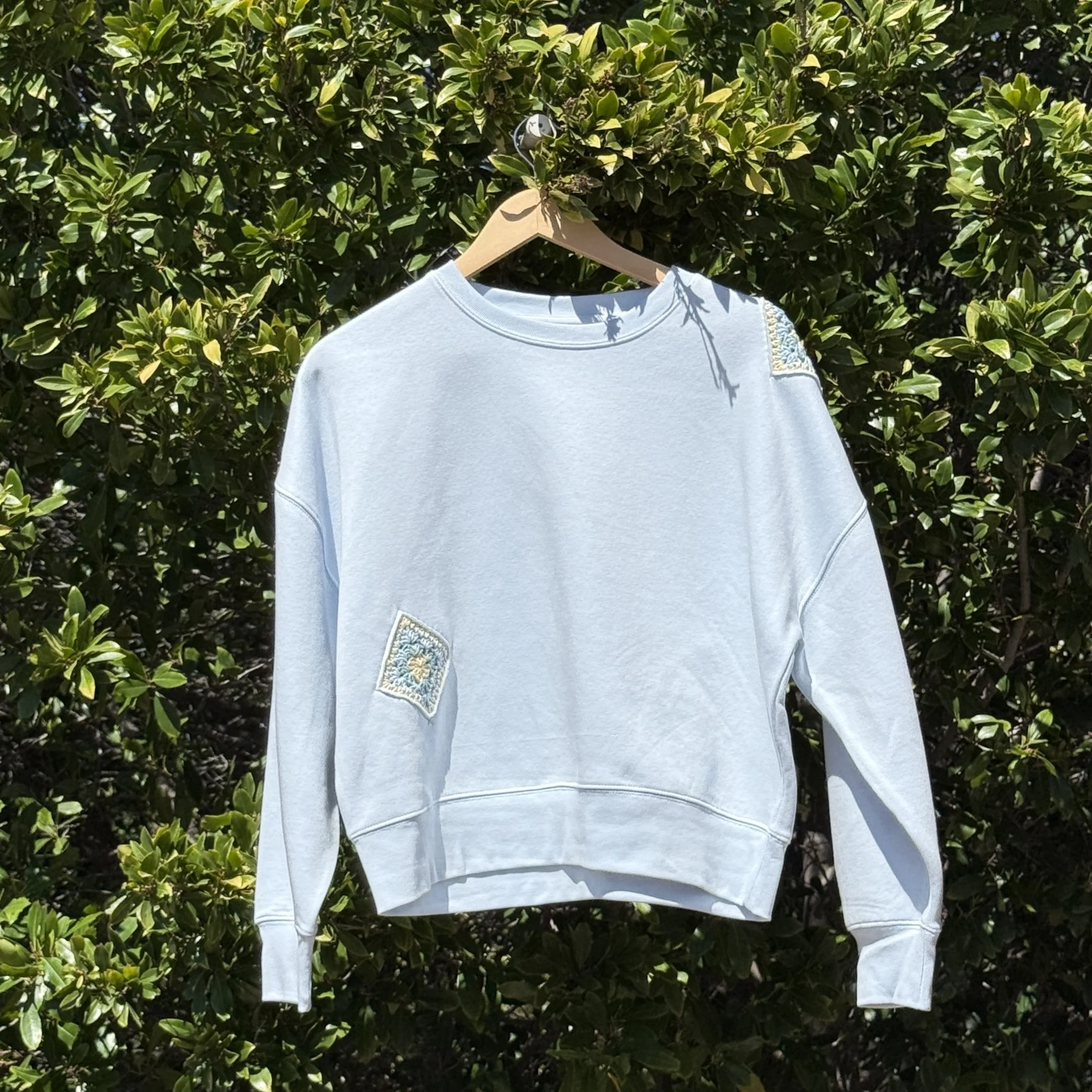 Medium weight crewneck sweatshirt decorated with crochet doodles.