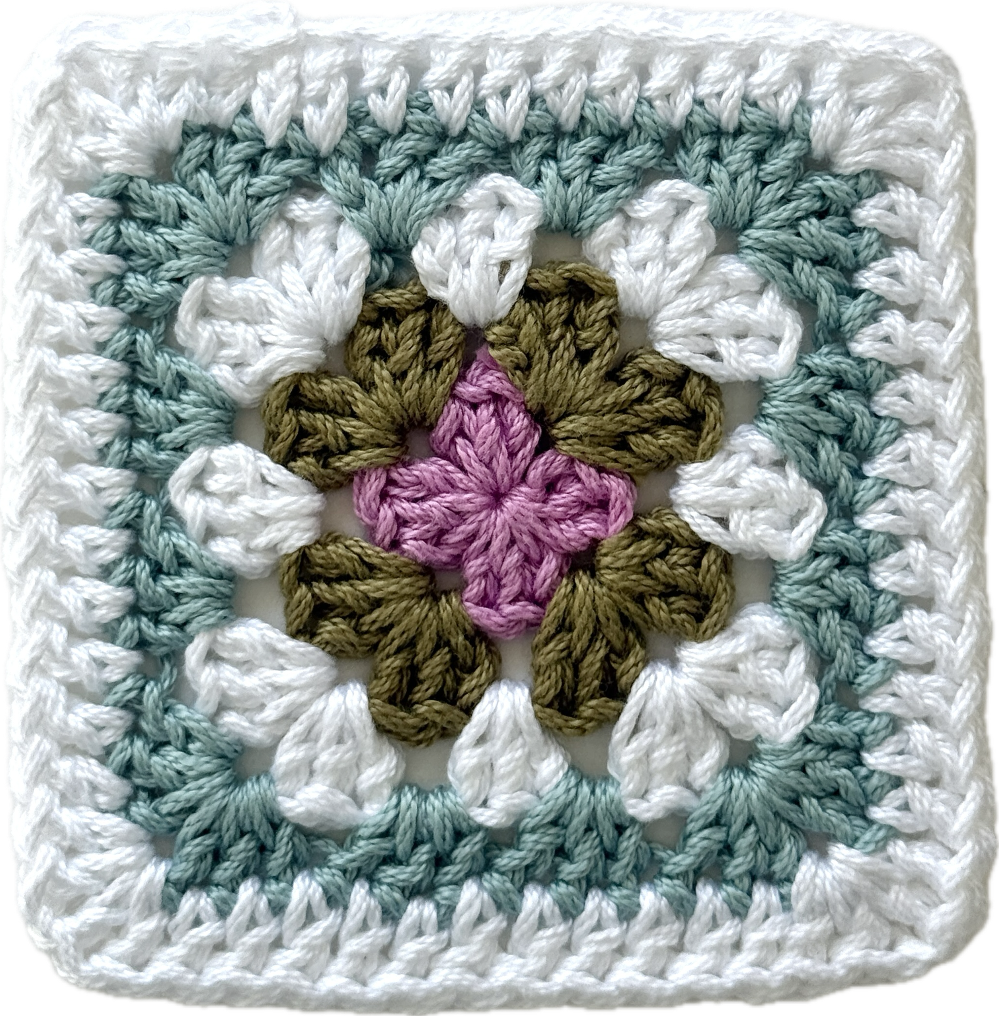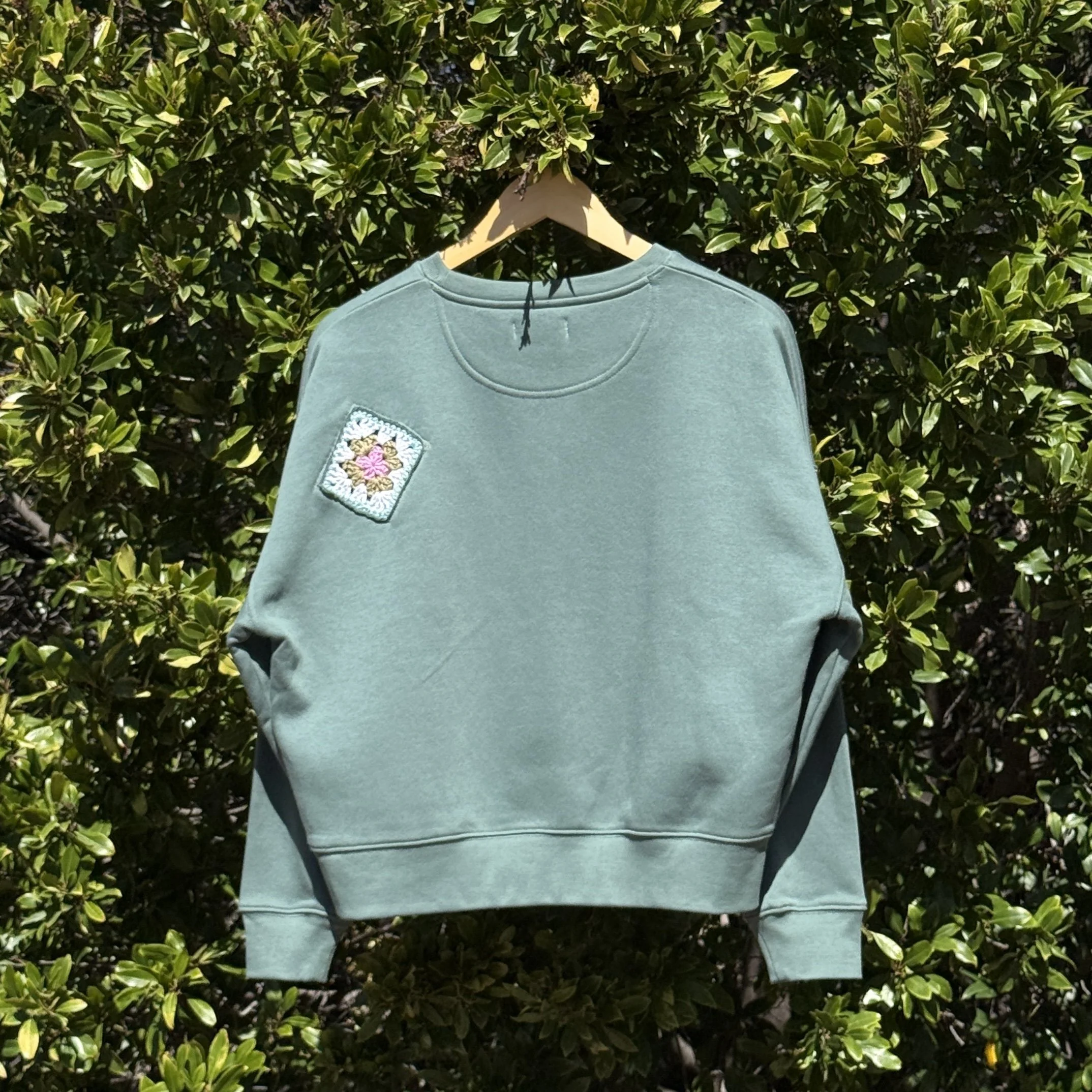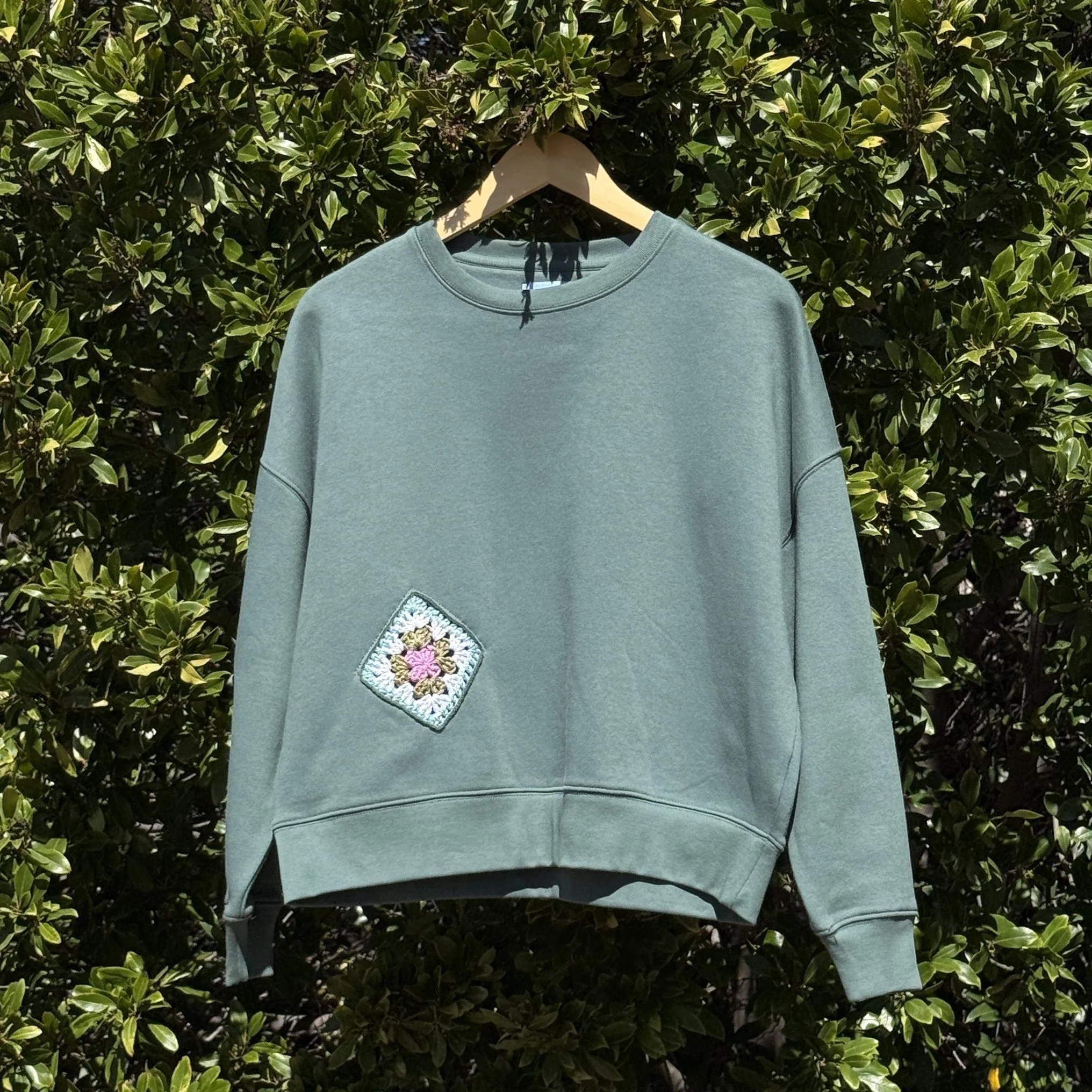 Medium weight crewneck sweatshirt decorated with crochet doodles.