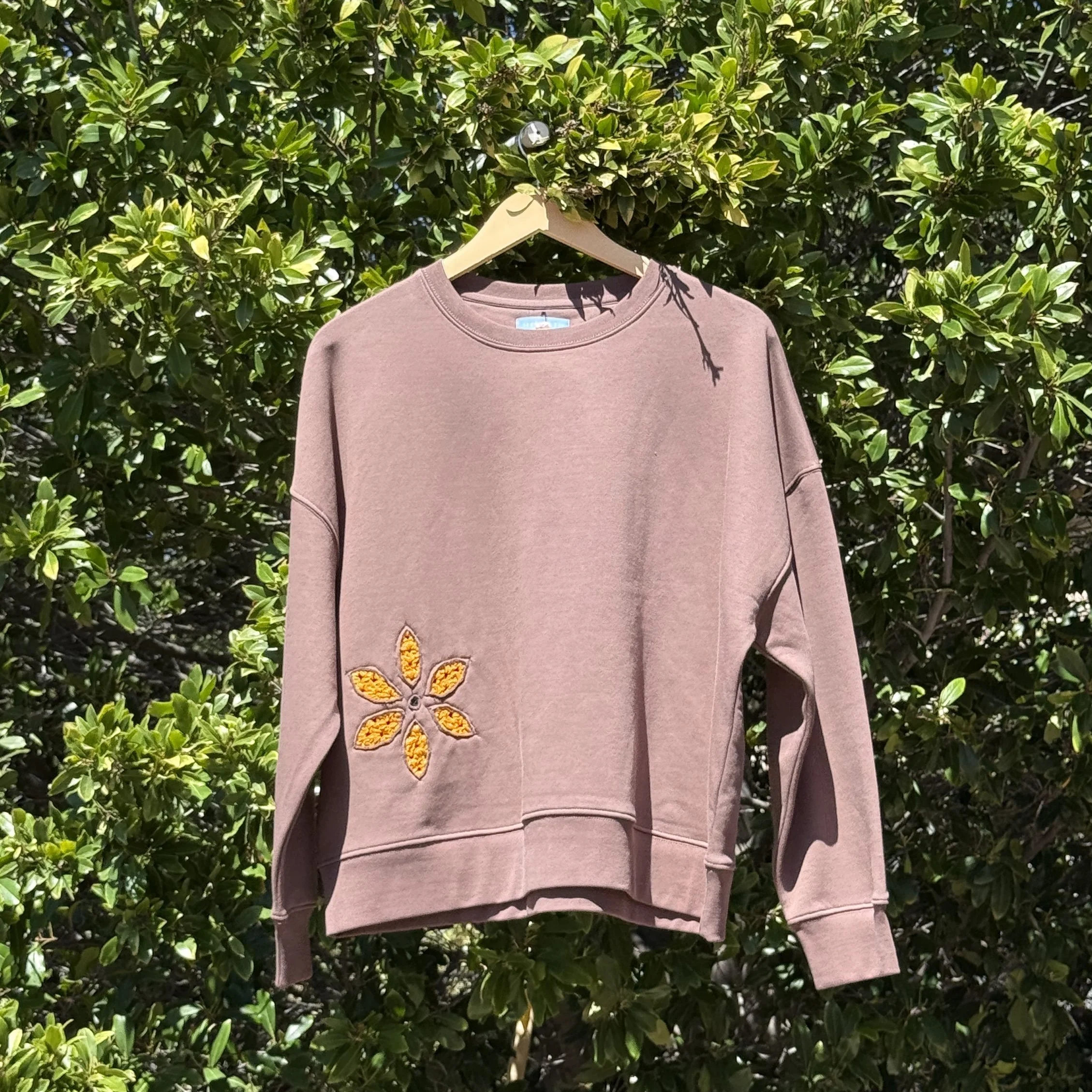 Medium weight crewneck sweatshirt decorated with crochet doodles.