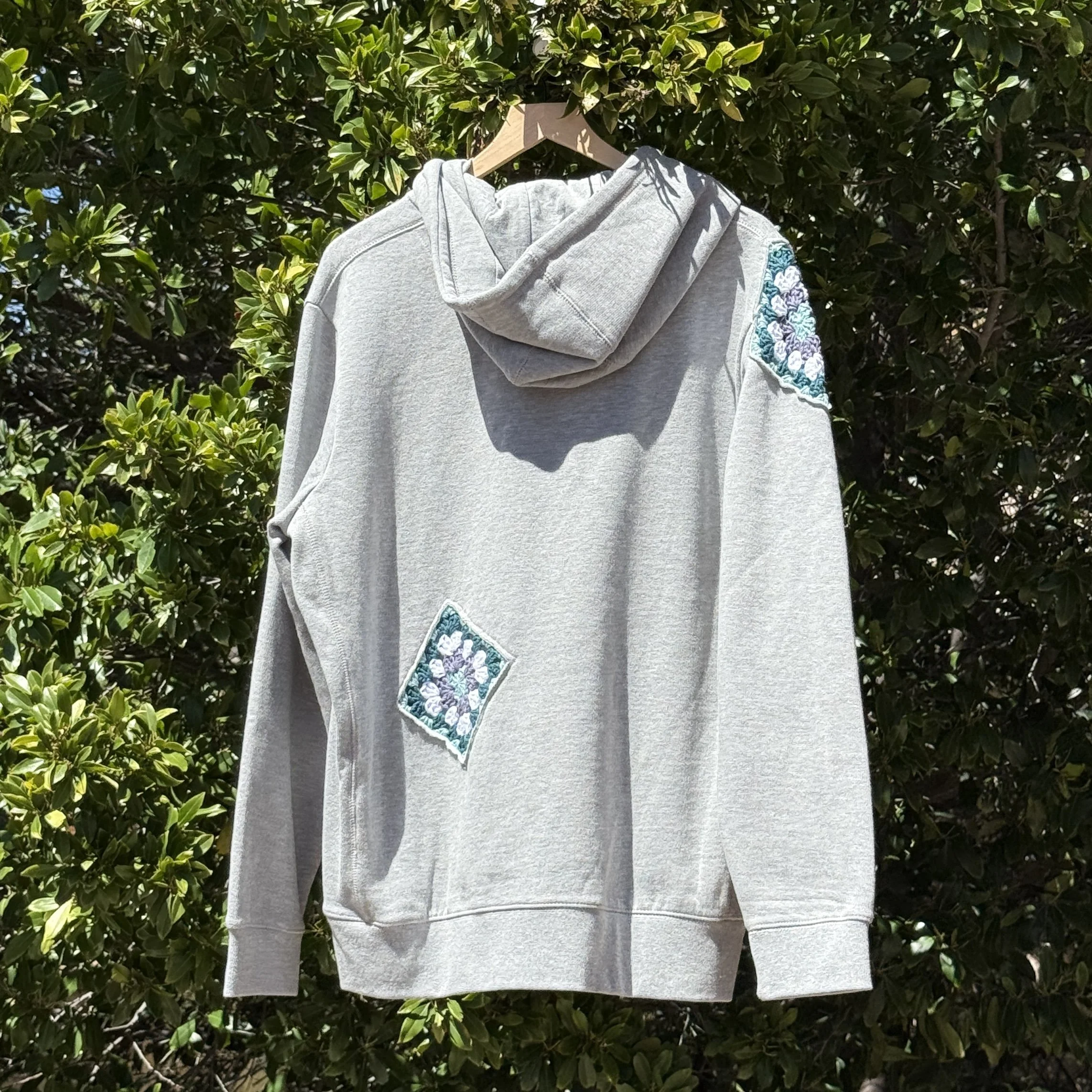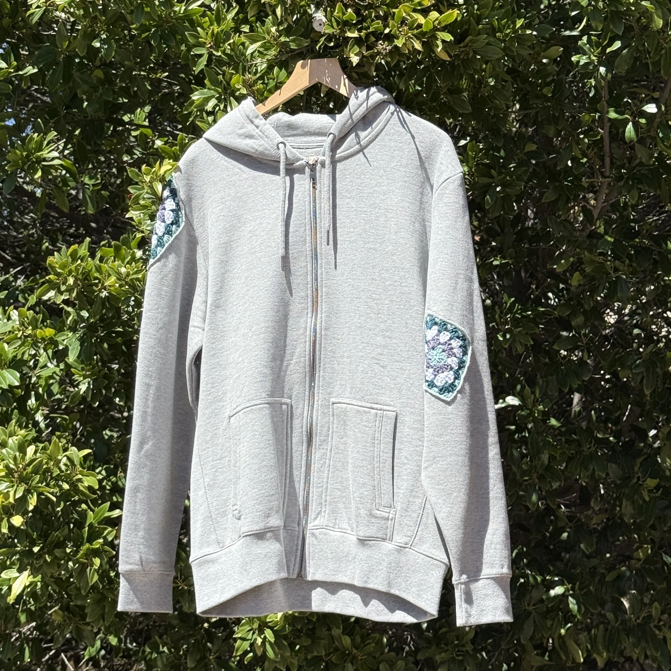 Heavy weight zip up sweatshirt decorated with crochet doodles.