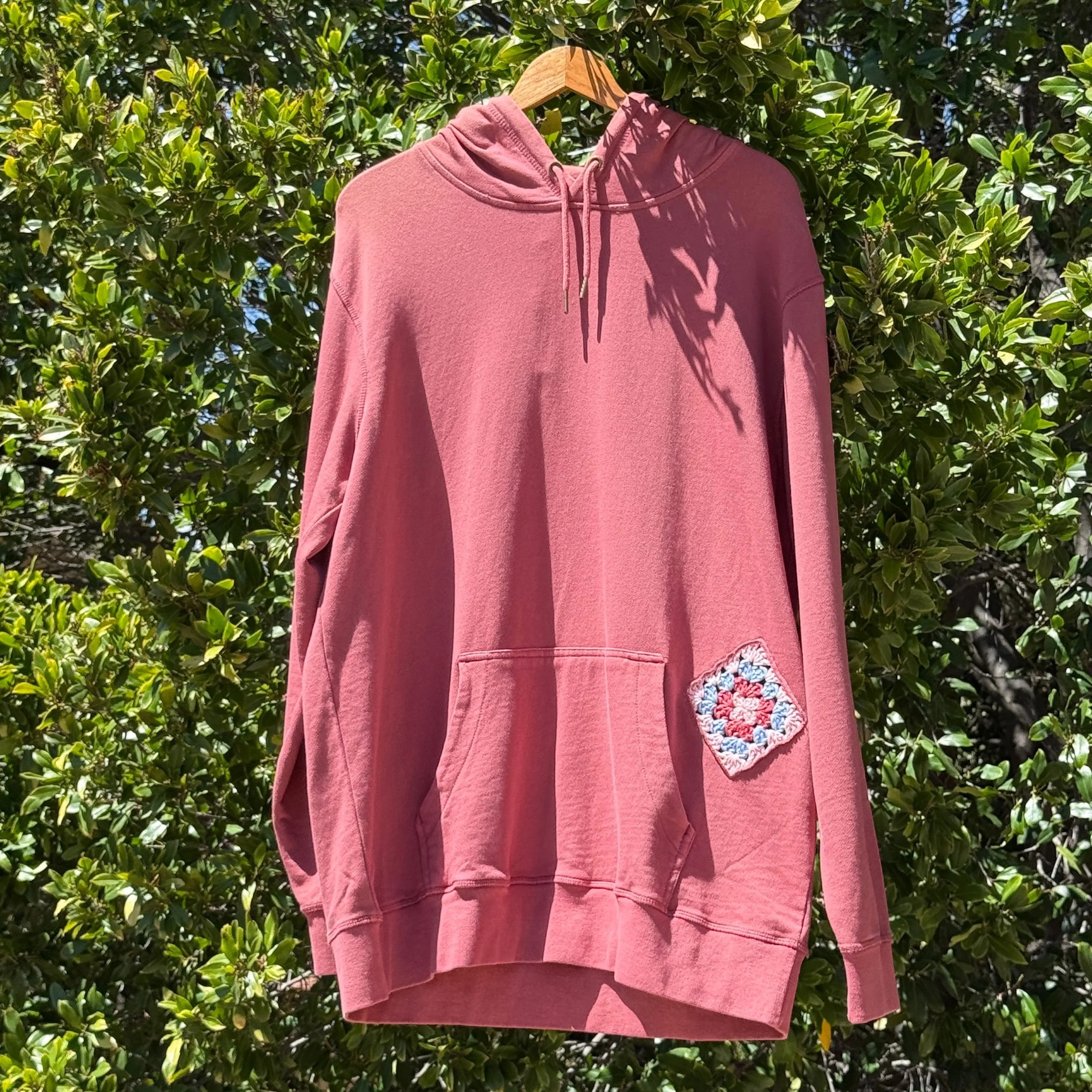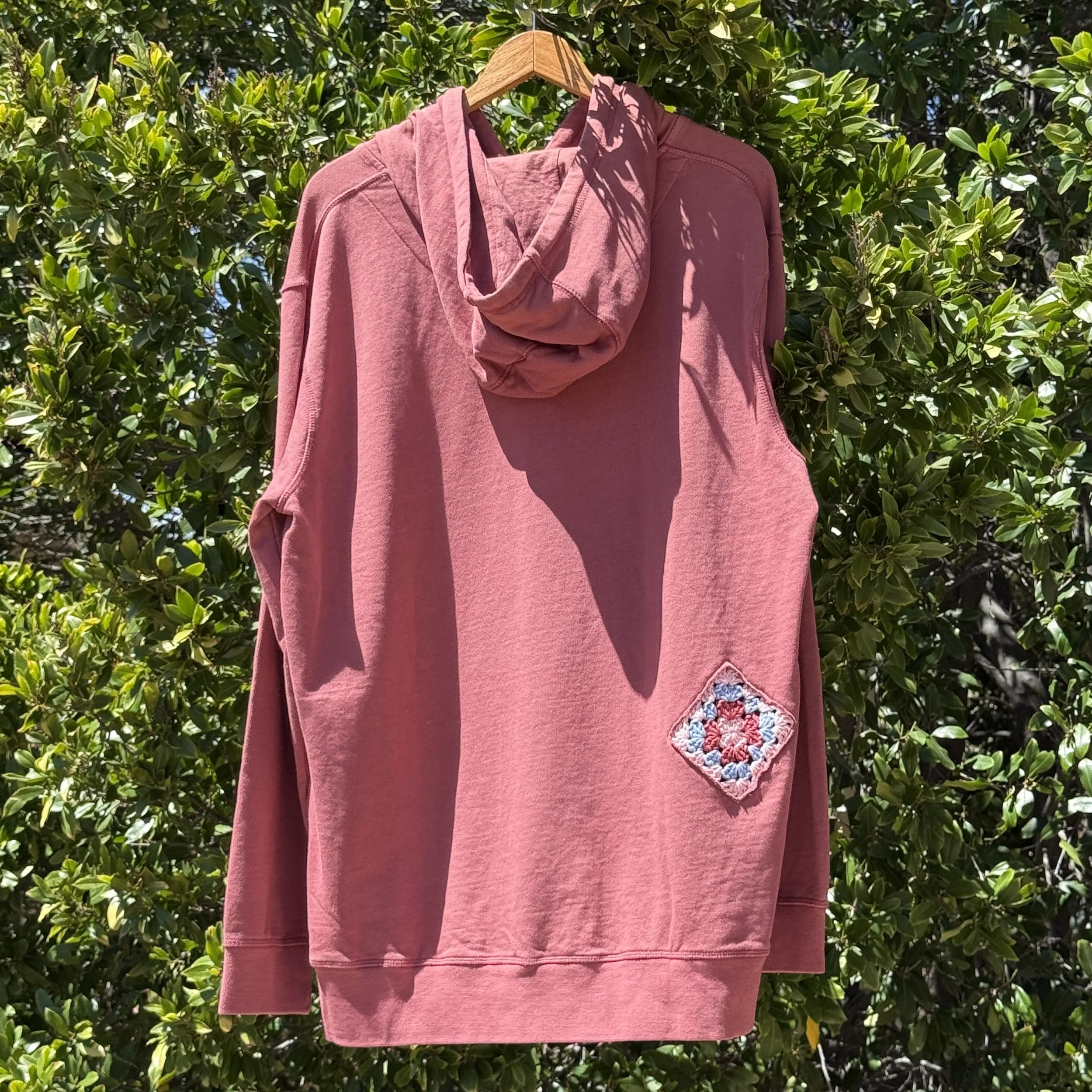 Medium weight terry hoodie sweatshirt decorated with crochet doodles.